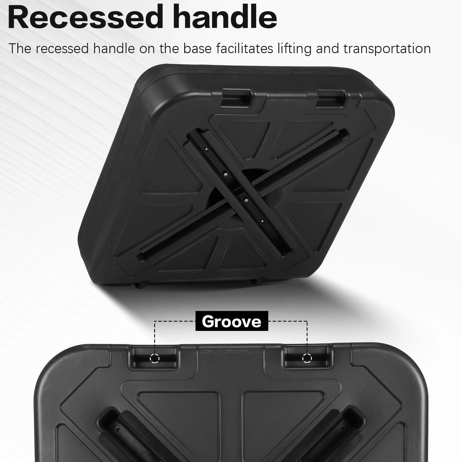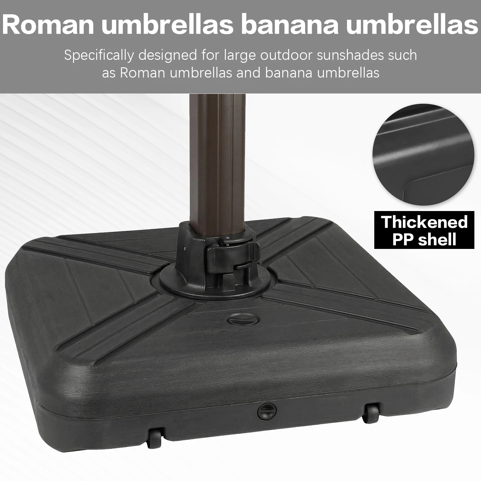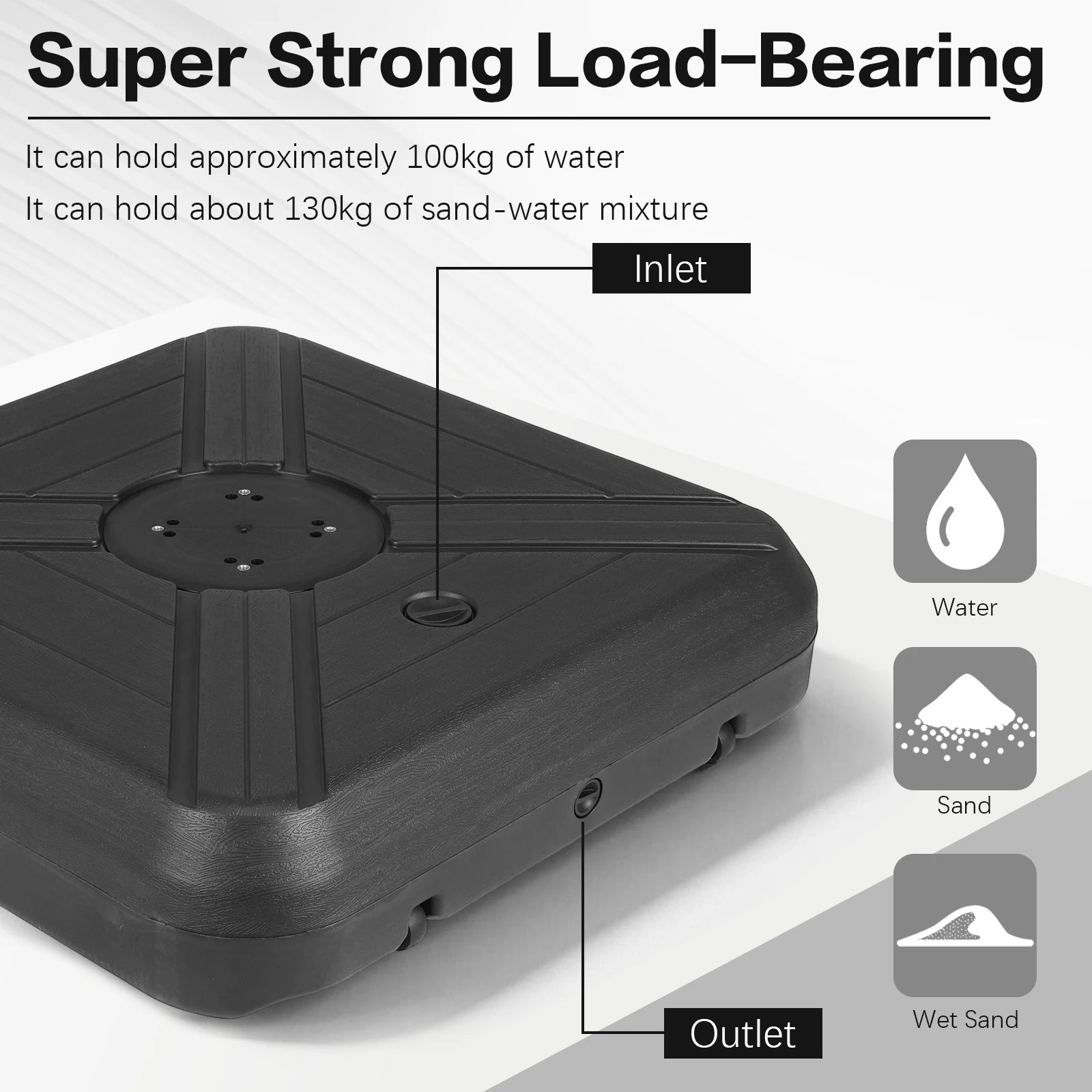 Cantilever Patio Umbrella Base with Wheels 130KG Capacity Water & Sand Filled Umbrella Base for Garden Backyard Deck Poolside Features: 1.Heavy Duty Support Design: Designed to handle up to 100KG of water or approximately 130KG with sand and water, this cantilever patio umbrella base ensures your sunshade remains stable and upright in all conditions. 2.Thickened PP Shell Construction: Built with premium thickened PP material, this square rolling umbrella base stand offers superior wear and corrosion resistance, boosting the durability and lifespan of your outdoor setup. 3.Effortless Mobility: Featuring four integrated wheels, this fillable mobile umbrella base allows for easy movement and quick adjustments to your umbrella's location without heavy lifting or hassle. 4.Versatile Weighting Options: Choose between filling with water, sand, or a blend of both-this parasol fillable base stand meets various needs and guarantees unwavering stability regardless of your preferred weight method. 5.Fit for Large Outdoor Umbrellas: Specially designed for large-scale umbrellas like offset and banana styles, this mobile parasol base provides reliable support for a broad range of outdoor shading solutions. Specification: Origin: Mainland China Material:PP Plastic Product Color: Black Product size:about 84cm (33.07in) x 84cm (33.07in) x 20cm (7.87in) Note: ![]() 1 x umbrella base |