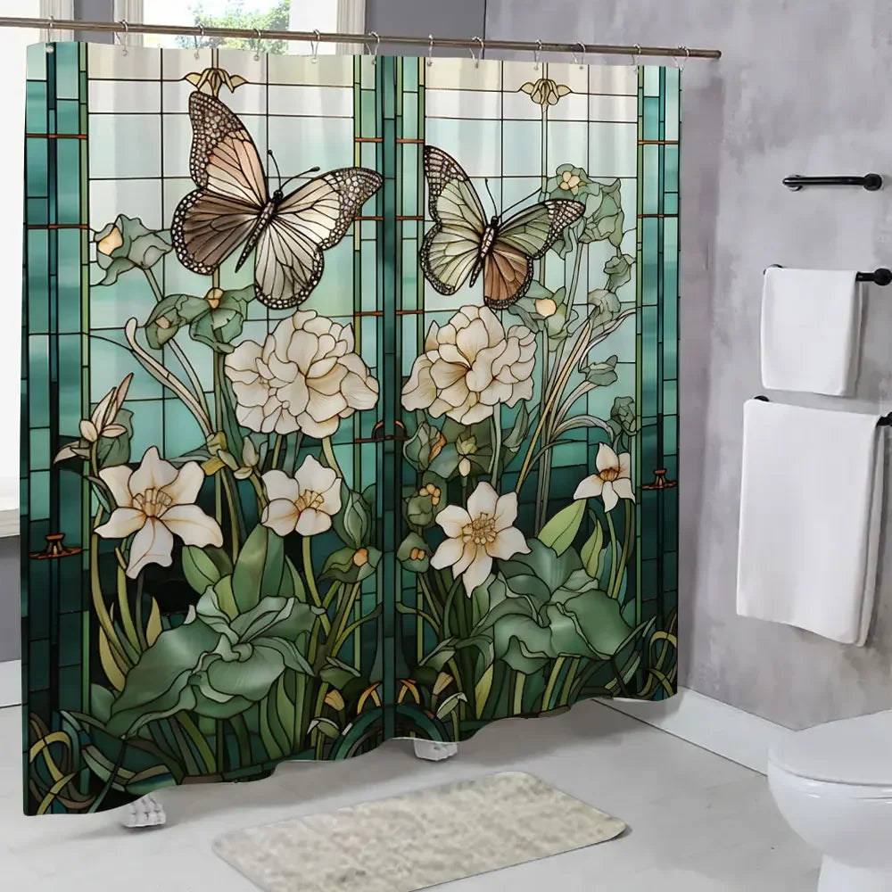 Colourful Glass Meadow Flower Butterfly Print Polyester Fabric Shower Curtain Home Hotel Apartment Bathroom Shower Curtain Decor