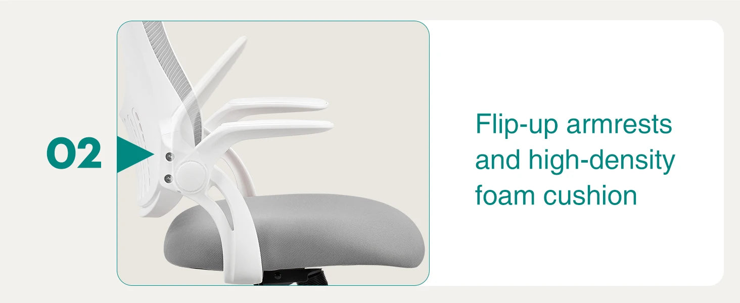 - Flip-up armrests provide flexible positioning to free space when you need it, while still offering arm support for focused work or long chats.