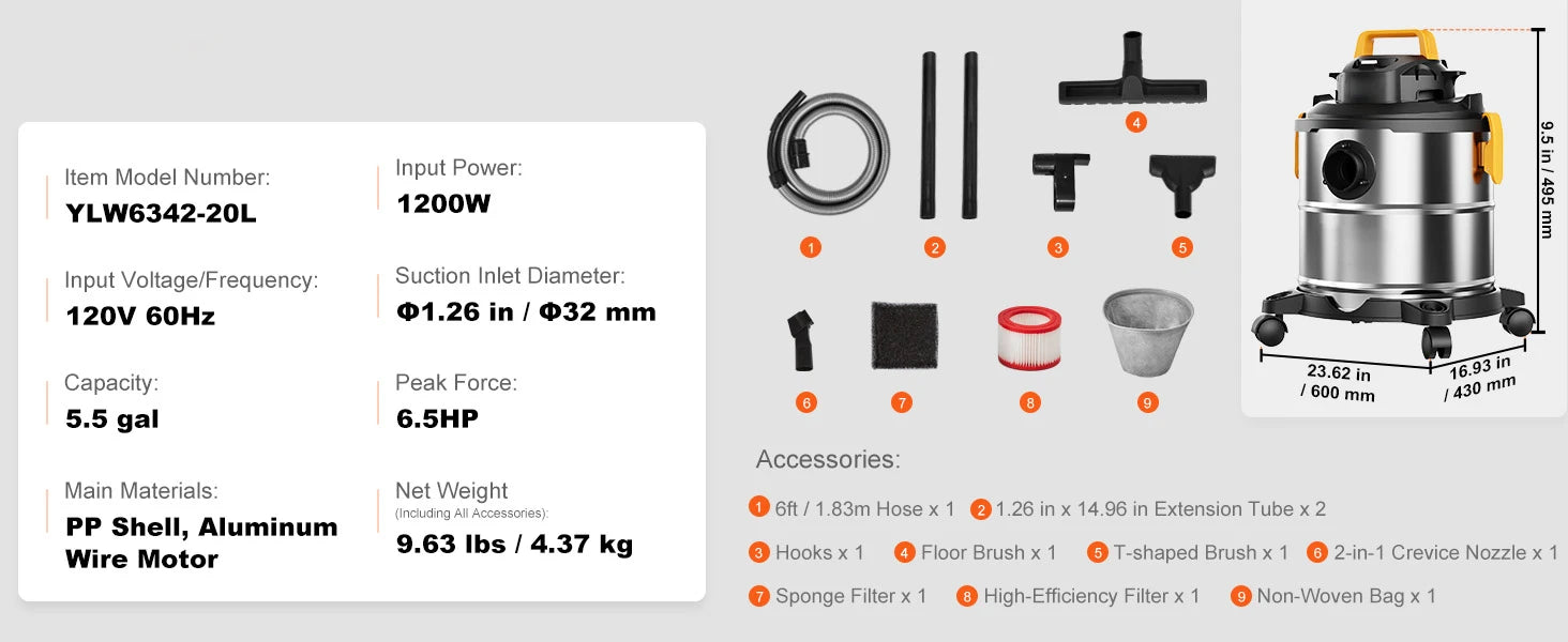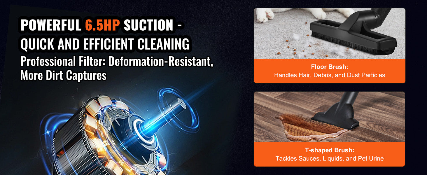 - 60CFM suction power and up to 6HP peak horsepower let you pull dust, debris, pet hair, and indoor liquid spills into the oversized bin without frequent stops.