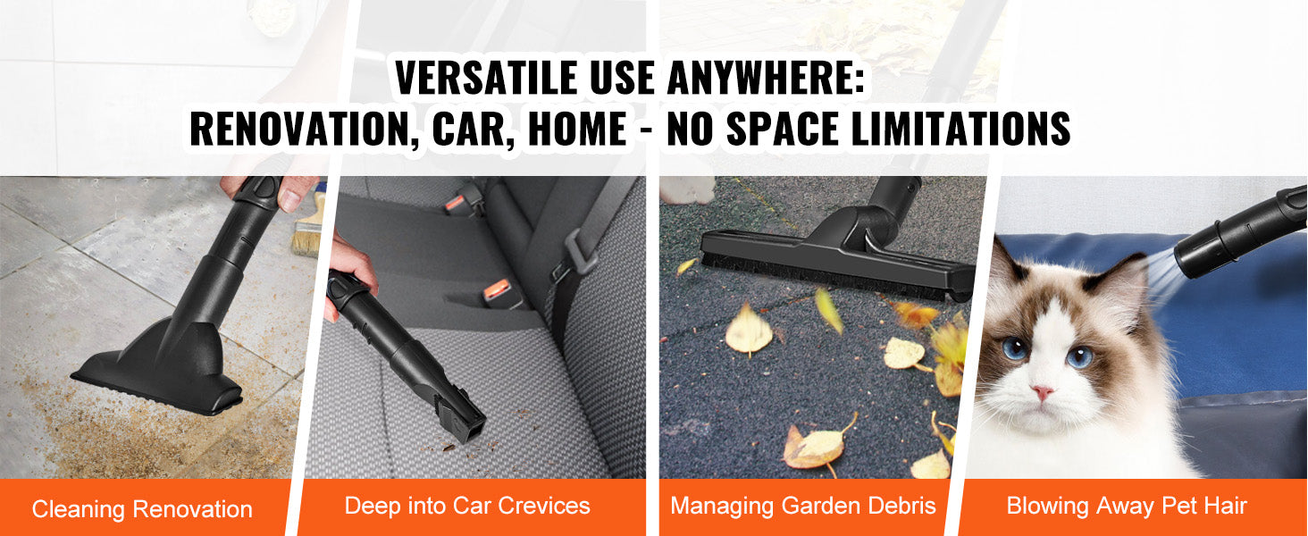 - User-friendly design includes 360° swivel wheels, a waterproof, shockproof switch, and a complete kit of attachments so you can clean surfaces, upholstery, curtains, car interiors, or use blowing mode.